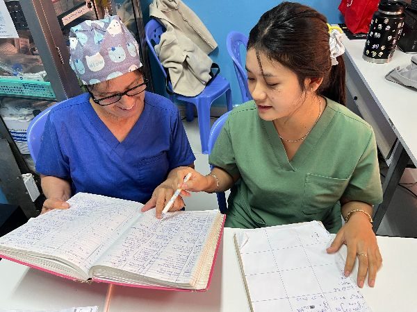 Ruth M., a retired U.S. nurse, moved to Cambodia with her husband after retirement and has spent the past year volunteering twice a week at CSC. She works alongside Cambodian nurses in the post-operative ward and the dressing and wound care room, supporting patients through recovery by monitoring healing, managing dressings, and providing compassionate post-surgical care.